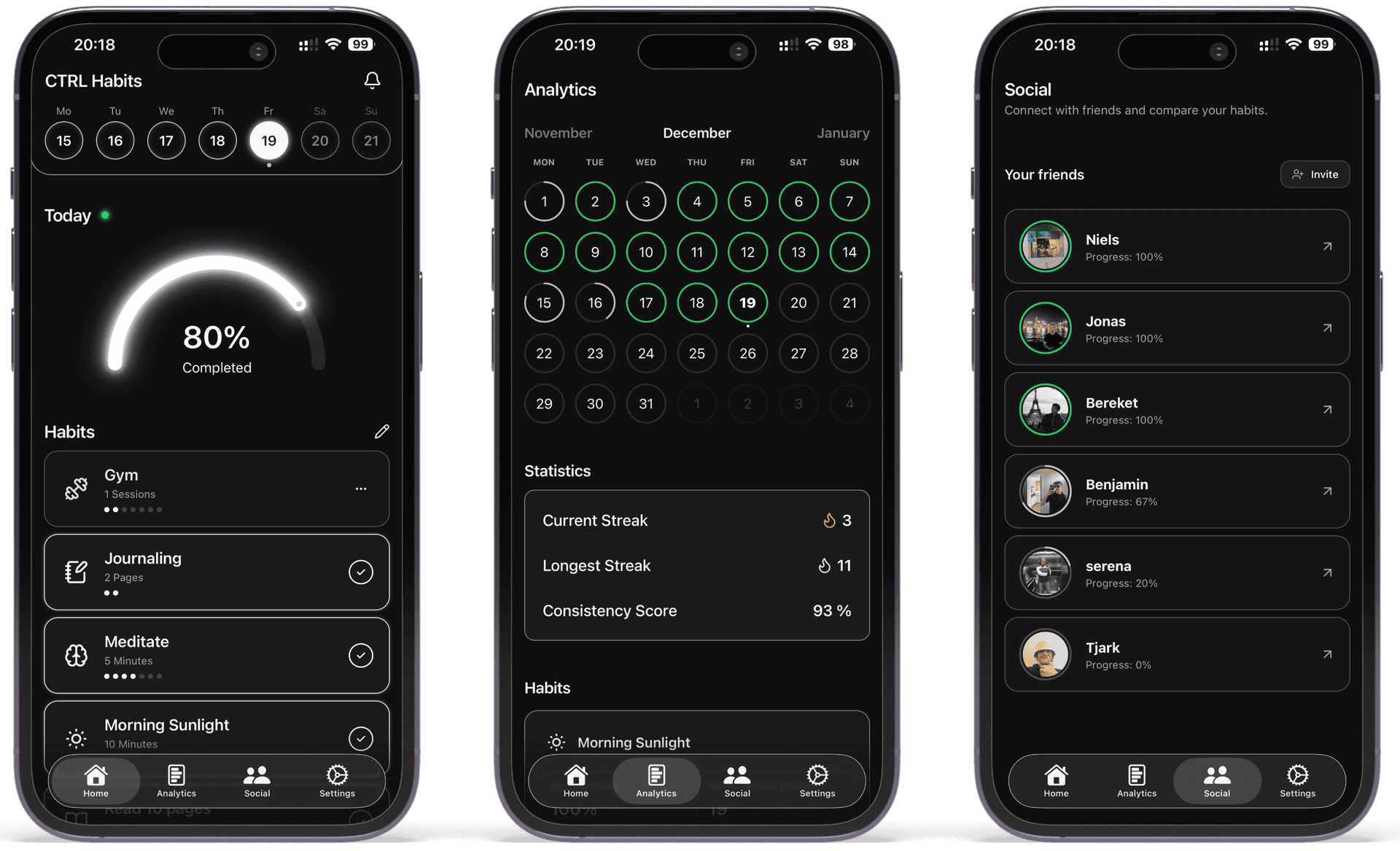 Turn routines into a team sport: exact times, pre-alerts and endless motivation. See your score and your squad’s in real time. Call out misses, celebrate wins, never drop the chain.